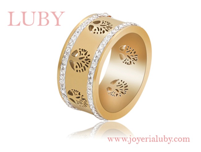 Anillo elegante con grabados de arboles de la vida y lineas de zirconia en chapa de oro 14K.