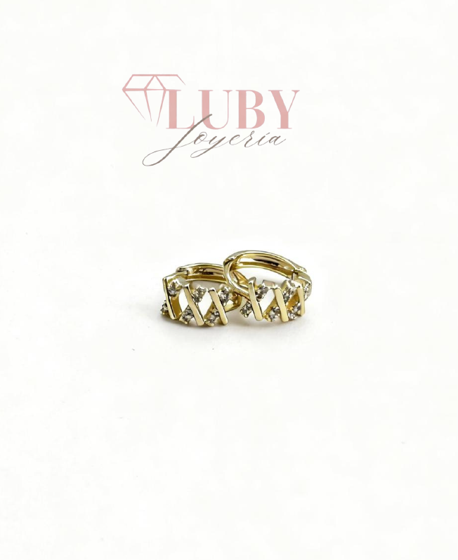 Hermosos Huggies con diseño en «x» con linea de zirconias en chapa de 14k.