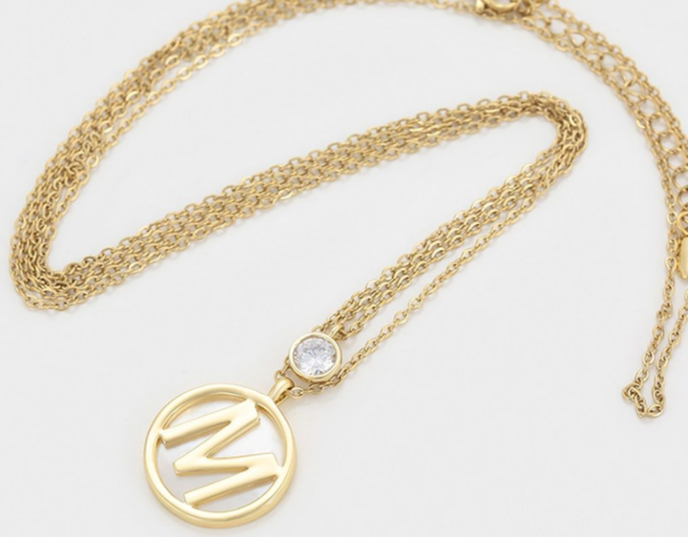 Collar largo con doble cadena con dije de una letra >>M<< brillante en chapa de oro de 14k.