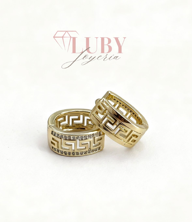 Hermosos Huggies con diseño griego en chapa de 14k.